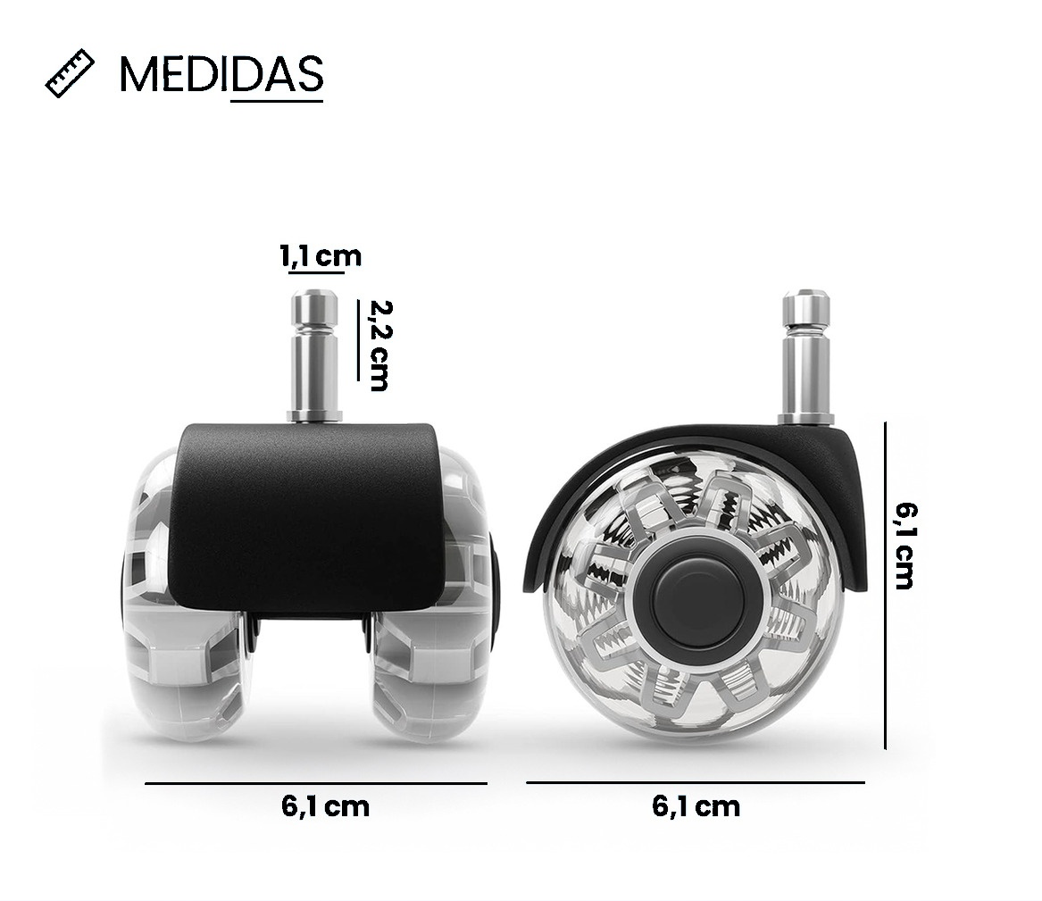 • Compatibilidad: Estas ruedas son compatibles con la mayoría de las sillas de oficina disponibles en el mercado, lo que las convierte en una opción versátil y conveniente.